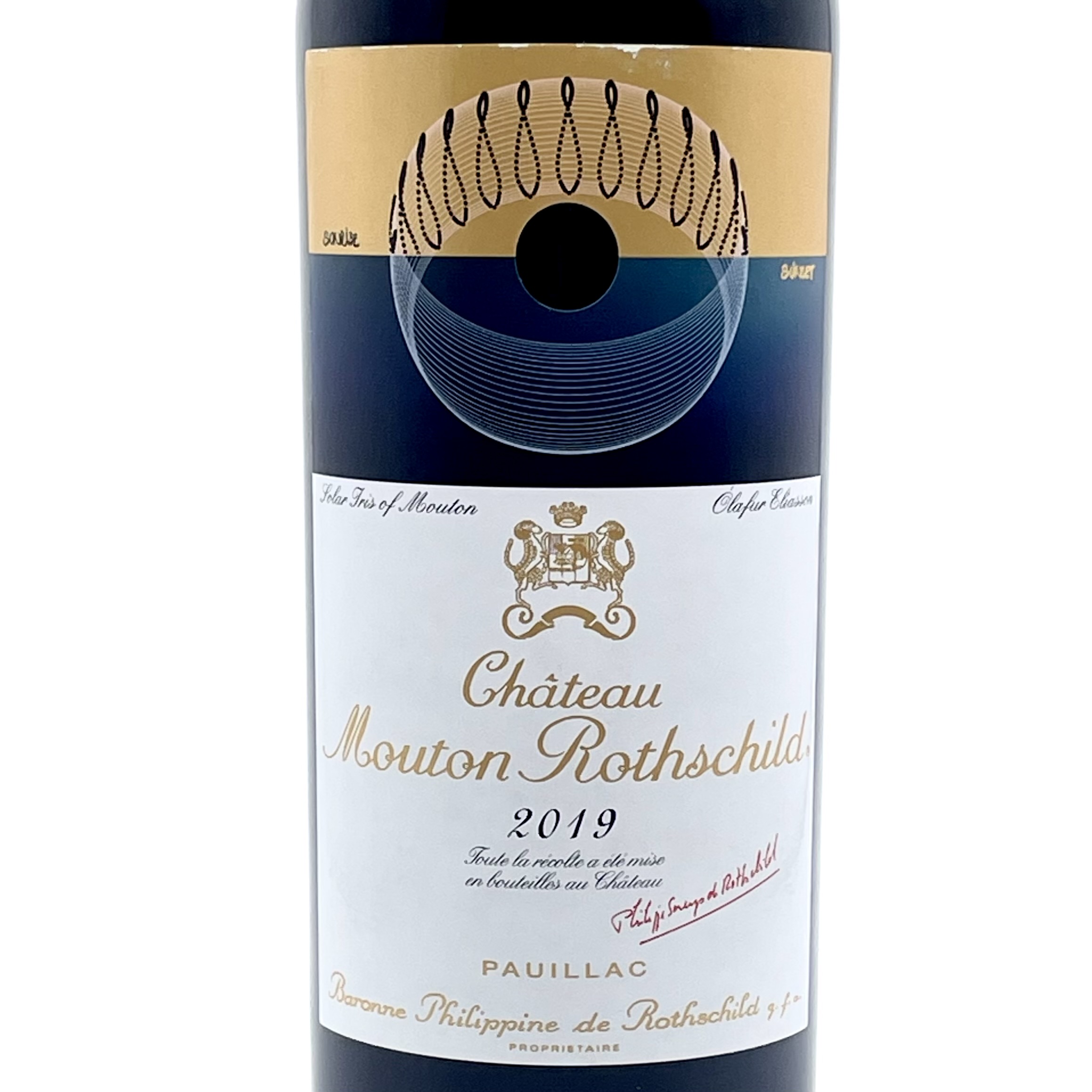 2019年は暖かい冬のあと、肌寒い春となりましたが、夏は暑く安定した天候に恵まれ、7月8月に適度な雨により水ストレスなく完璧といえる状態で収穫期を迎えました。アートラベルはデンマーク出身の芸術家オラファー・エリアソンが手掛けた「ソラー・イーリス・オブ・ムーン」。上下2部で構成され、上部は金色に輝く色彩が昼を、深青のニュアンスで彩られた下部は夜を象徴しています。ラベル中央はくり抜かれ、ボトル内のワインがその姿を覗かせます。丸窓を囲むように楕円が連なり、輪を形成し、これは地球から見た太陽の動きを描いています。